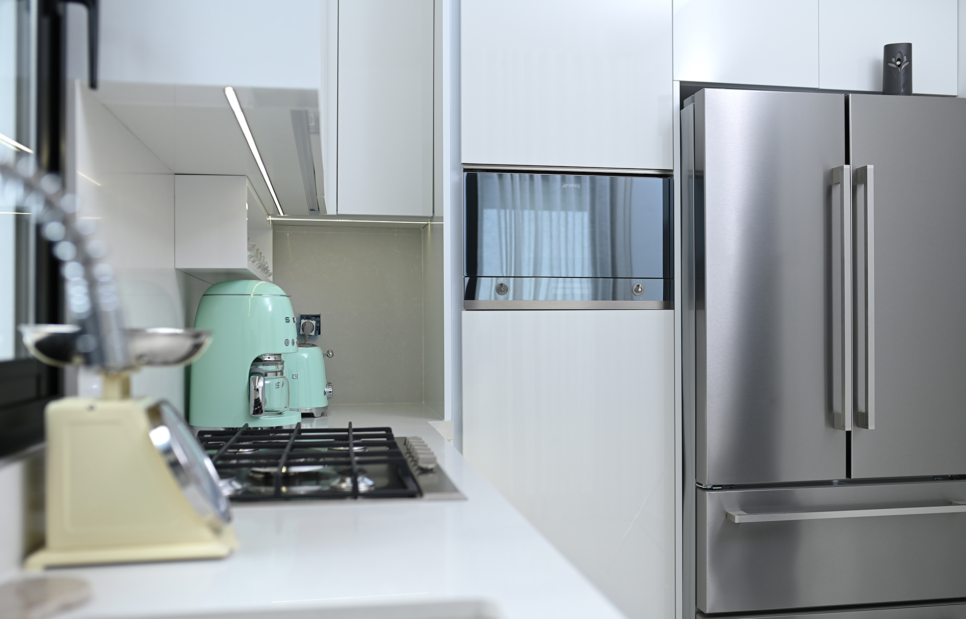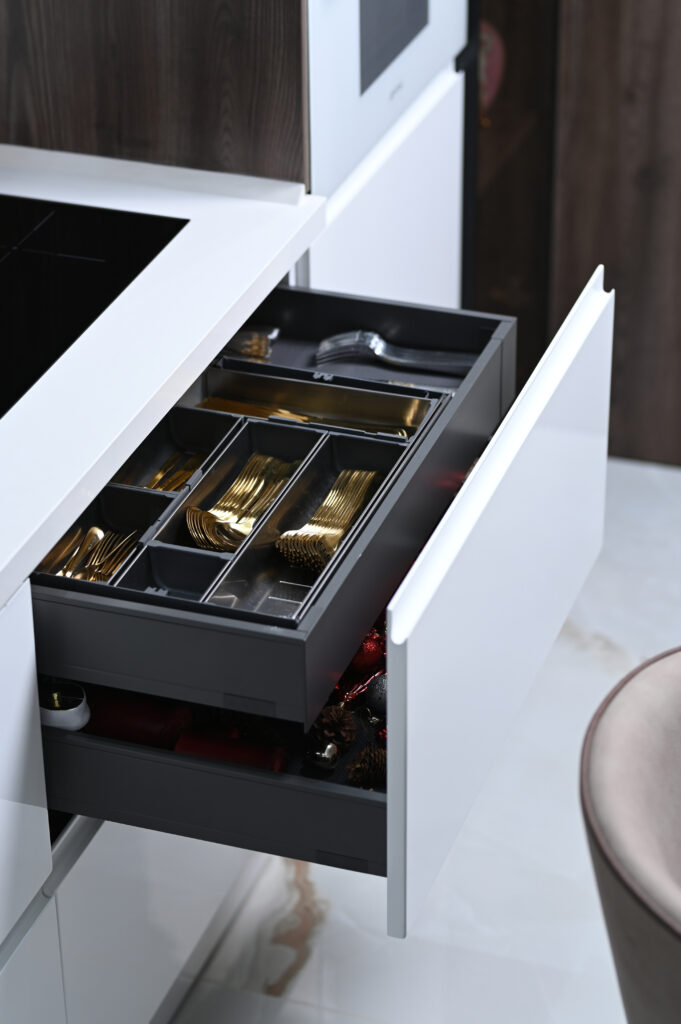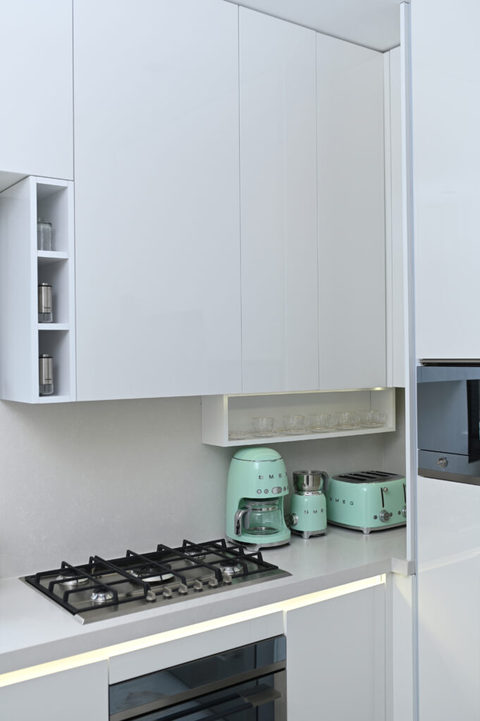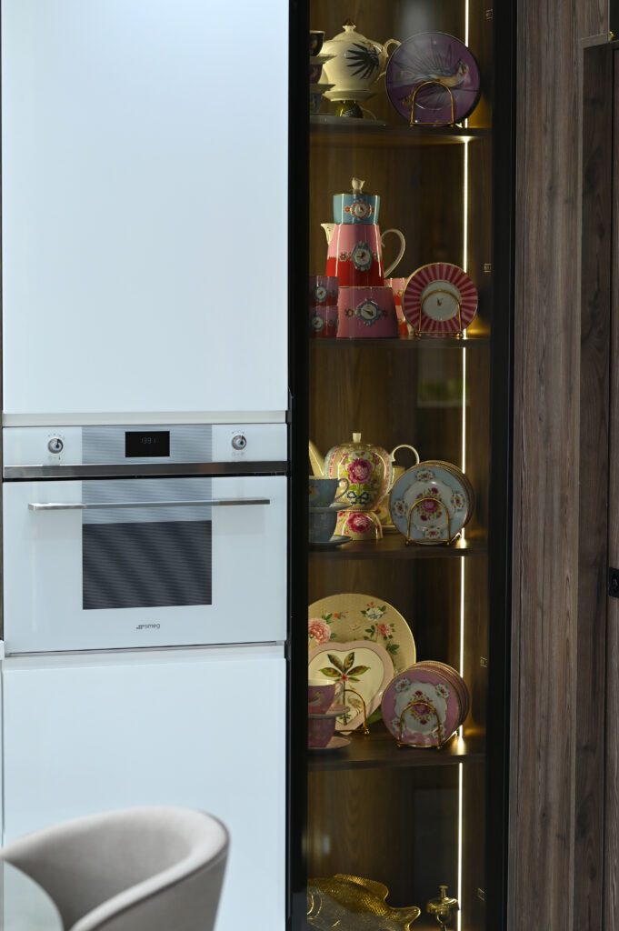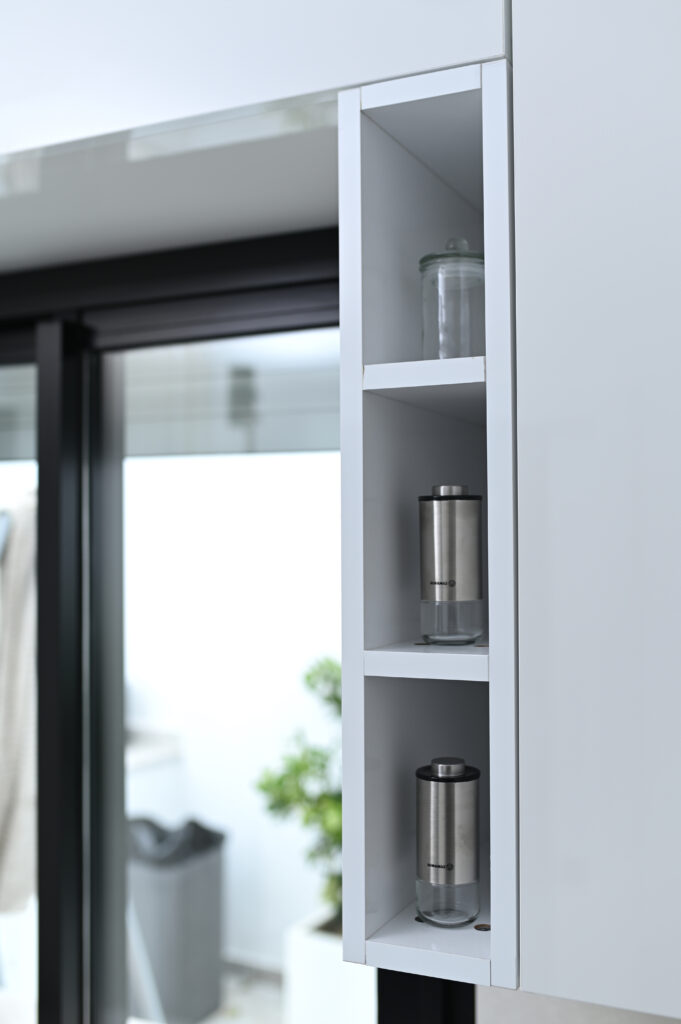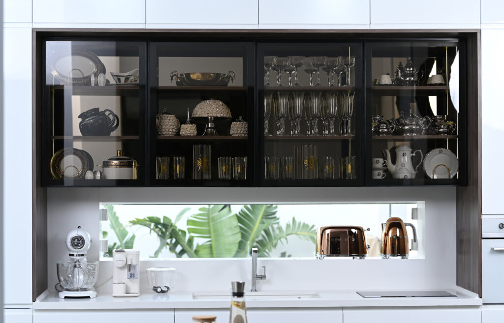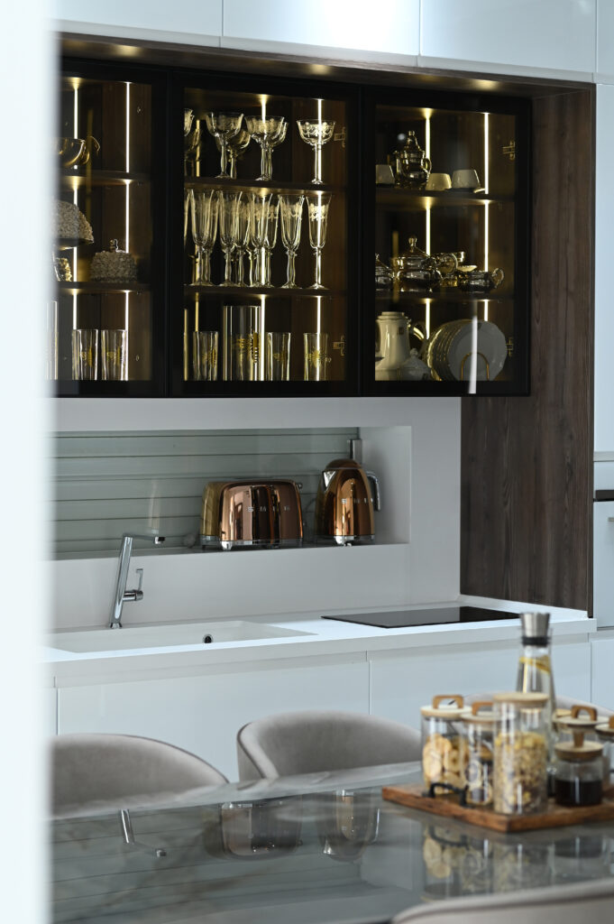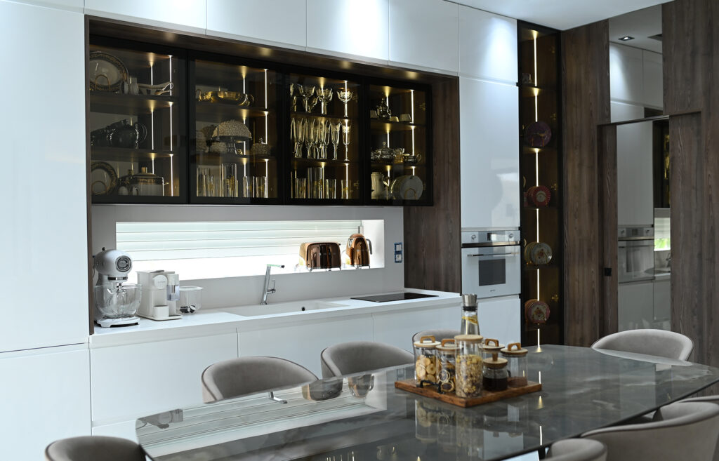 Les éléments vitrés, disposés horizontalement et verticalement, maximisent l’espace de rangement tout en ajoutant une note contemporaine. Grâce à l’éclairage LED intégré, ils subliment votre cuisine en créant une ambiance à la fois chaleureuse et élégante, alliant esthétique et praticité.