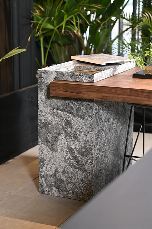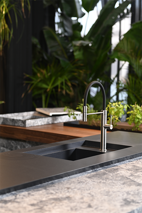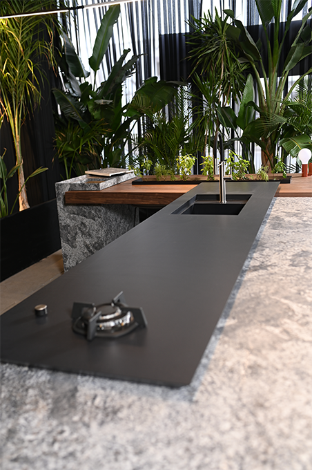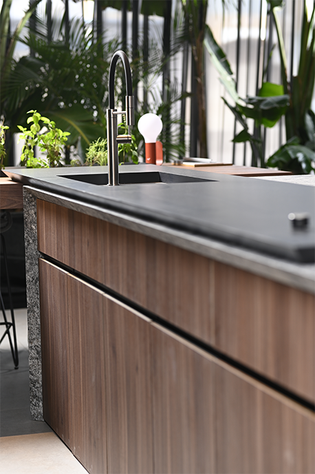 L’outdoor kitchen combine design moderne et fonctionnalité en extérieur, avec des matériaux durables, des équipements en inox, un barbecue intégré, des espaces de rangement optimisés et une aire de repas conviviale.