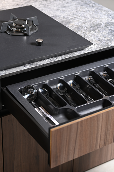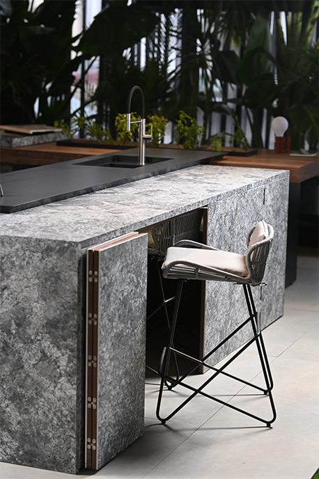 Plan de travail et crédence en quartz, agrémentés d’éléments vitrés à effet miroir.